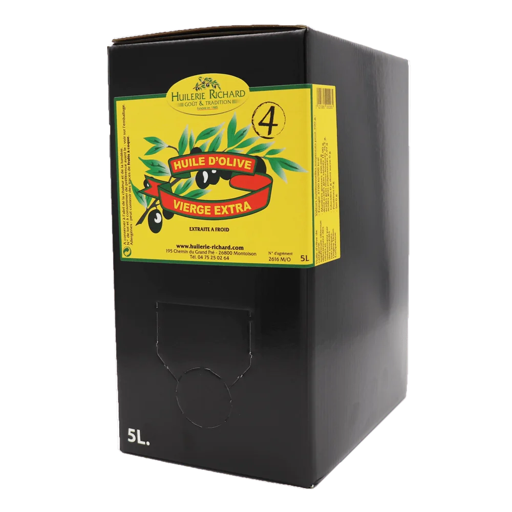 Grâce au savoir-faire séculaire de la famille Richard, cette huile d’olive 5L N°4 en BIB est le fruit d’un assemblage patient et rigoureux d’olives sélectionnées du bassin méditerranéen.